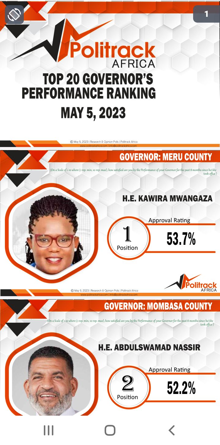 The Politrack Africa polls has ranked Meru Governor Kawira Mwangaza as top performing county boss in the latest opinion survey with a stake of 53.7 percent The polls which were seen by safinews.co.ke on Saturday dated 5th Friday, May, indicated Mombasa Governor Abdulswamad Nassir as second taking 52.2 percent. Murang’a boss Irungu…