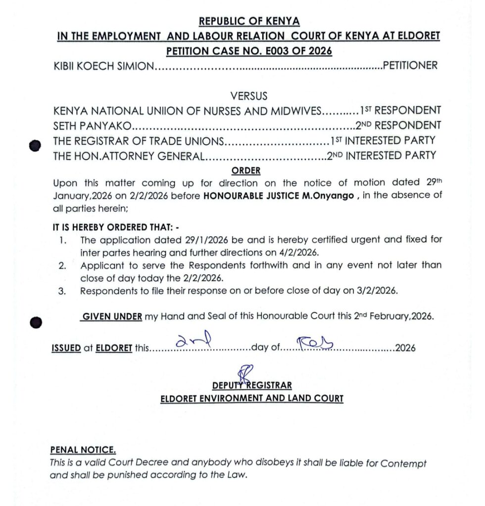 According to the petition seen by safi news on Monday 2nd February and submitted at Eldoret High Courts by Kibii Koech through lawyer Nyakio Kirwa and Company Advocates, against two respondents Kenya National Union of Nurses and Midwives and Seth Panyako, as their Secretary General.